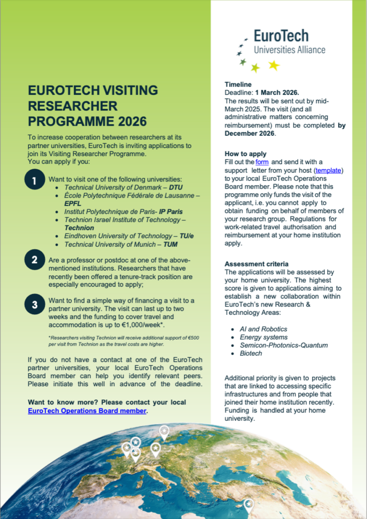 The applications will be assessed by your home university. The highest score is given to applications aiming to establish a new collaboration within EuroTech’s new Research & Technology Areas: