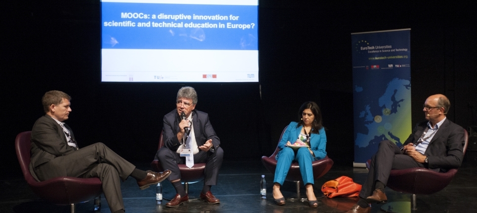 07 July 2014 | The session ”MOOCs: a disruptive innovation for technical universities in Europe?” brought together four key leaders in the educational field, in Europe and overseas, to discuss the future of education in light of the changes and the potential future developments of massive online open courses, MOOCs. The EuroTech Universities have been forerunners at producing MOOCs in Europe, producing 23 different MOOCs between them, with several more currently in production and due to be launched in September 2014 or during the course of 2015.